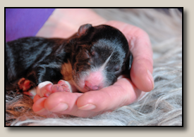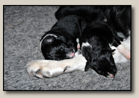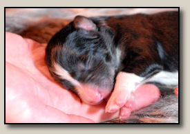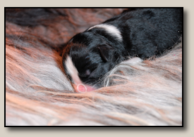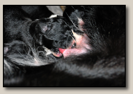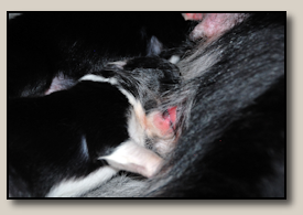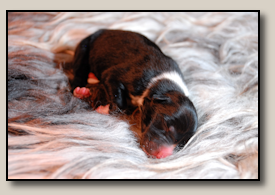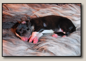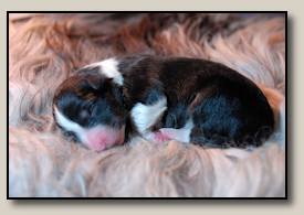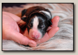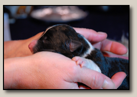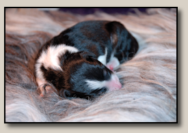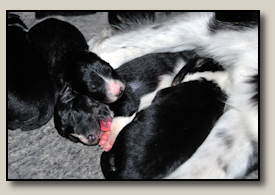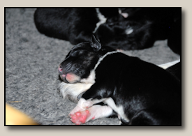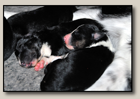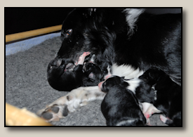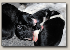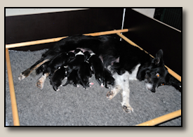Saturday the 12th of November the pups were born. At 5:25 o'clock in the morning the first pup came. 3,5 weeks after the mating we took an ultra sound which showed 3 pups. So when 3 pups were born, we hoped there would some more, even when they weren't there on the ultra sound. And yes, nr. 4 came and even nr 5. But Alisha didn't stopped pupping. Nr. 6 and 7 followed and this went on until 10 pups were born. Unfortunately one pup was stillborn, so 9 beautiful pups - alive and kicking ;) 1 black/white bitch, 3 tricoloured bitches and 5 tricoloured dogs. Herunder you can see some pictures of them :) |